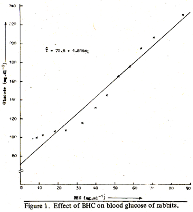 The blood glucose of group A remained fairly constant (100 to 108 mg/dl) while that of the group B increased from 100 to 231 mg dl in twelve weeks. Statistically this difference was highly significant (P<0.01). The correlation analysis between the accumulated BHC amount and glucose levels in blood of treated rabbits, revealed a highly significant positive correlation (r = 0996). The regression analysis (Figure I)