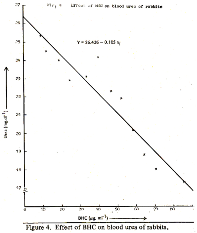 revealed that for every one microgram per ml accumulation of BHC in the blood, a corresponding 0.02 g/dl of total proteins increased in the blood. The hyperproteinemia has also been reported by other workers6-8. The blood urea of group A remained fairly constant (24.8 to 25.1 mgf dl) while that of the group B decreased from 253 to 17.3 mg/dl in twelve weeks. Statistically this difference between control and treated was highly significant (P<0.Ol). The correlation analysis between the accumulated BHC and urea levels in the blood of treated rabbits, revealed a highly significant negative correlation (n—0.95). The regression analysis (Figure 4)