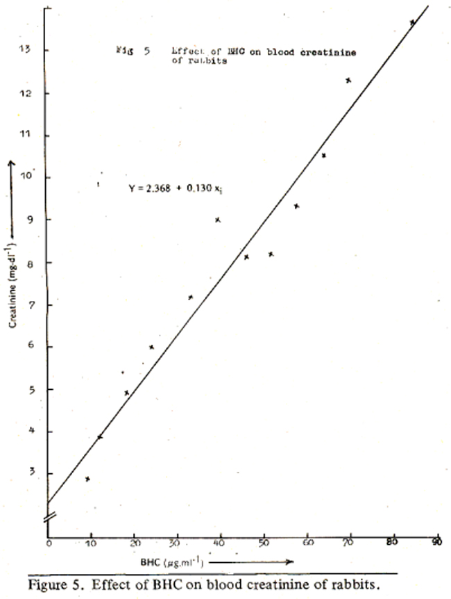 indicated that for every one microgram per ml accumulation of BHC in the blood, a corresponding 0.105 mg/dl of blood urea was decreased. Other workers9 reported a non significant decrease of urea in the blood of workers exposed to BHC. The analysis of blood for creatinine indicated almost constant values (1.95 to 2.1 mg/dl) in the control group, whereas those of treated group increased from 2.9 to 13.6 mg/dl in twelve weeks, showing a highly significant difference in the two groups. The increased values of blood creatinine due to the accumulation of BHC in the blood, were used to fit regression line (Figure 5)
