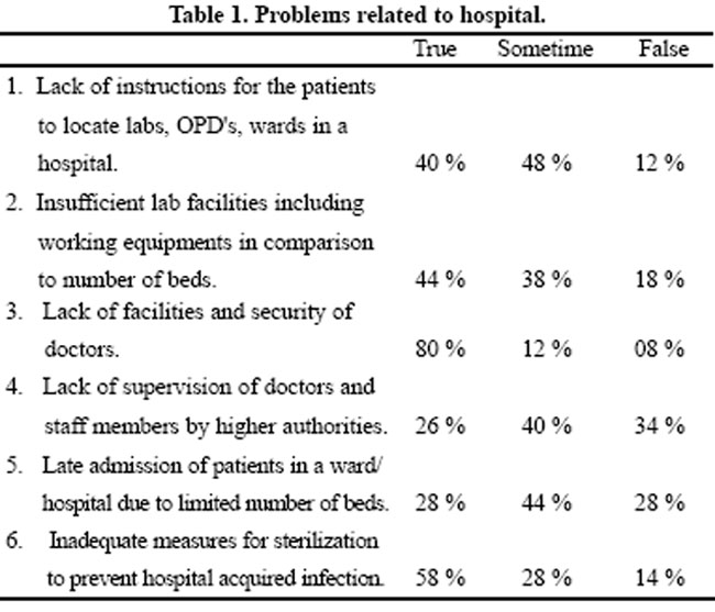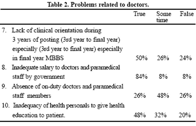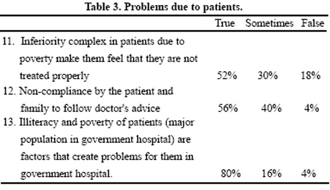 The reasons for the problems, related to patients, were three. Of these three reasons, the last one i.e. "Illiteracy and poverty of patients are factors that create problems for them in government hospital" was marked true by 80% of doctors. Other reasons in a range of 30% to 60% are shown in Table 3.