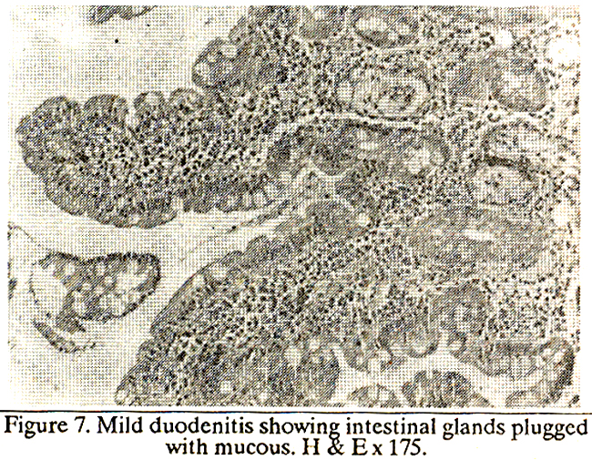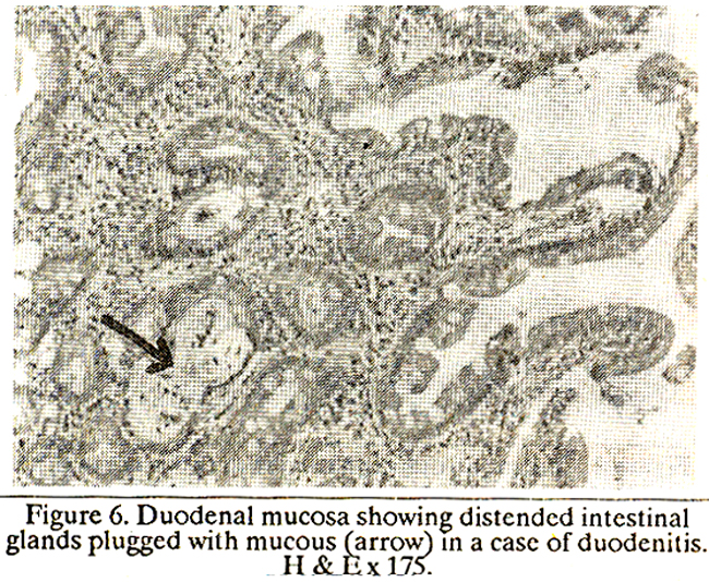 The intestinal glands (crypts of Leiberkuhn) became dilated, circular or oval in outline. The lining cells became cuboidal with loss of columnar and goblet cells and the lumen became distended with mucus similar in appearance to that of Brunner's glands (Figure 6-7).