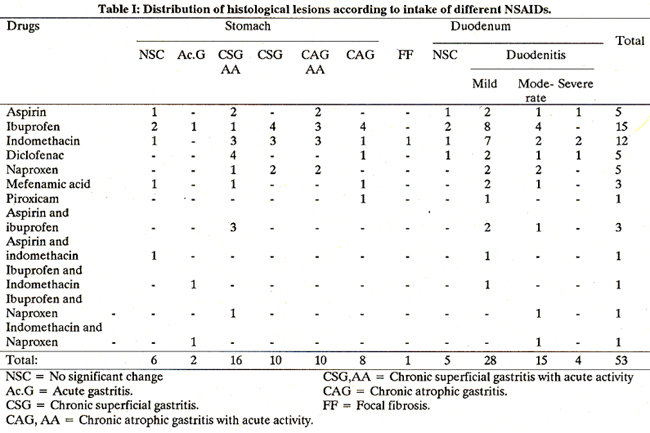 In one patient (1.8%) focal fibrosis was seen without any evidence of gastritis. Regarding; the type of chro-nicgastritis, chronic superficial gastritis with acute activity was found to be the commonest lesion (30.18%) as shown in table I. In 42 patients, antral gastritis was seen either alone or along with gastritis at the other sites. In only 5 patients, the antrum showed no change in the presence of gastritis elsewhere in the stomach. The distribution of histological lesions in relation to the NSAIDs used is shown in table I.