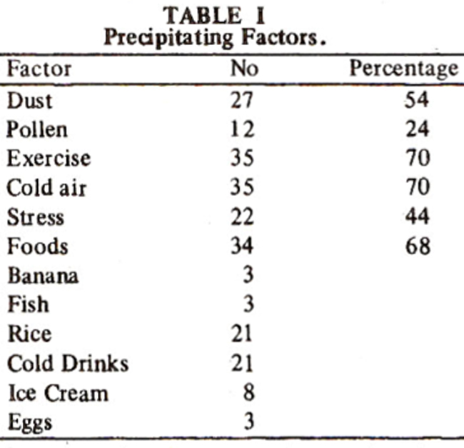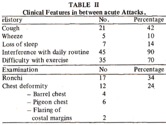 Thirty six (72%) presented with acute episode of wheezing and four (8%) had history of wheezing at the time of admission. Nine (18%) had persistent cough or breathlessness and one was in status asthmaticus. In 15 (30%), asthma started before their second birthday and in 31 (62%) before their sixth birthday. Severity of acute attacks was graded into mild, moderate and severe on the basis of the treatment required to control it; namely, oral therapy, parenteral bronchochiators and hospita¬lisation. Afticks were mild in 26(52%), moderate in 19(38%) and severe in 5 (10%). The frequency of attacks was increasing since the onset in 19 (38%), decreasing in 2 (4%), while in 13(26%) it was unchanged. Common precipitating factors included cold air (70%), exercise (70%), dust (54%) and various foods (68%).Table I. In between the acute attacks, 2 1 (42%) had persistent cough and 5 (10%) had wheeze. Asthma interfered with daily routine in 45 (90%); and in 35 (70%) exercise was difficult or impaired. An examination in quiscent phase revealed ronchi on auscultation in 17 (34%) and chest deformity in 12 (24%) (Table II).