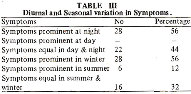 The disease was more troublesome during the night and in winter in 28 (56%). Six patients (12%) had symptoms more prominent during summer. Maximum cases (54%) were admitted’ in the three months of August, November and January. Twenty eight (56%) presented during winter months, and 22 (44%) during summer months (Table III).