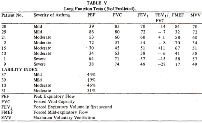 Eosinophiia (more than 250 eosinophiia/ mm)3 was found in 71% patients. Chest roent¬genography revealed hilar prominence in 12%, increased bronchial markings in 94% and hyperin¬flation in 27%. Peak expiratory was less than 80% of Predicted in 22 (44%). All 8 showed decreased values of FVC; FEV1/FVC ratio, FMEF (forced mid-expiratory flow), PEF (peak expiratory flow) and MVV (maximum voluntary ventilation). Four patients tested for lability of airways by exercise testing were all found labile with a lability index of more than 30% (Table-V).