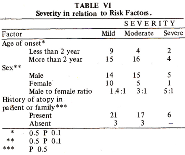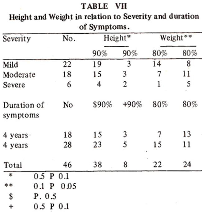 Severe degree of asthma was associated with failure to gain weight (P <0.10) although height was history of atopy although male sex appears to be associated unaffected (P<0.l). Duration of symptoms was not related statistically to height and weight attained (Table VII).