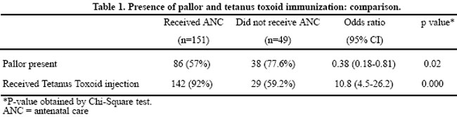Table 1 shows that pallor was significantly lower among women using antenatal care (57%) as compared to those who were not (77.6%) (p value 0.02). Tetanus toxoid coverage was higher among women using antenatal care (92%) compared to those who were not using antenatal care (59.2%) (p value 0.01).