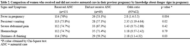 Statistically significant difference was found among women who received antenatal care as compared to those who did not in recognizing fever (OR=2.8, 95%CI 1.4-5.5), persistent vomiting (OR=2.35, 95%CI 1.19-4.64) and dizziness and fainting (OR= 1.18, 95 CI 0.57-2.42) as danger signs in pregnancy. There was no significant difference between the two groups with regards recognizing severe abdominal pain and haemorrhage as danger sign in pregnancy.
