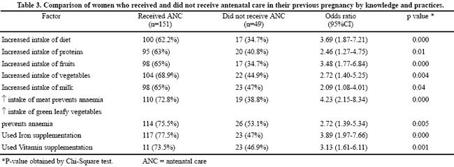 Antenatal care utilization was significantly associated with the level of awareness regarding quantity of food utilization during pregnancy. Women who received antenatal care knew the importance of adequate intake of proteins, vegetables, fruits and milk during pregnancy. They also knew that green leafy vegetables and organ meat were beneficial in preventing anaemia. This is in accordance with another study in urban squatter settlement of Karachi.15