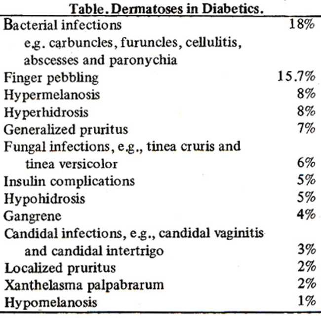 Sixty eight percent had dermatoses associated with diabetes or its therapy as shown table.