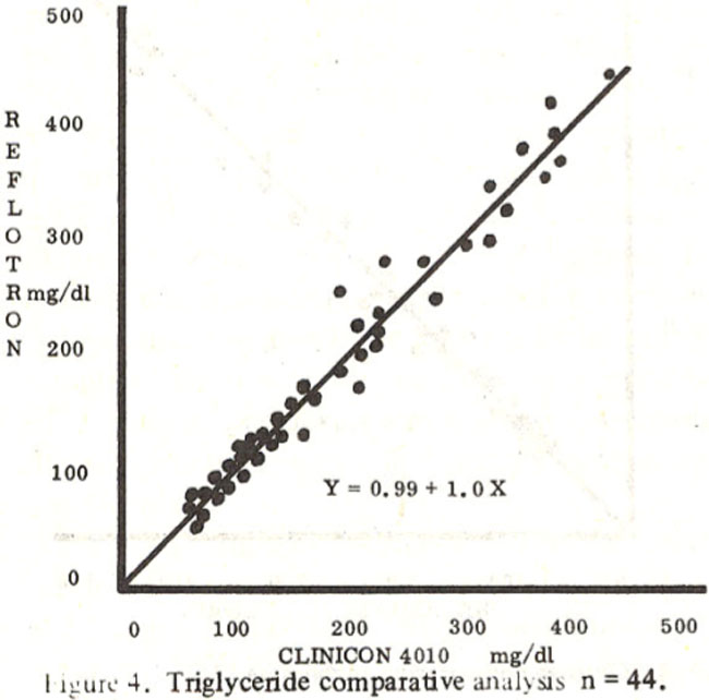 Figure 4 shows comparison of triglyceride estimation on Reflotron with Clinicon 4010. Correlation coefficient of r= 0.98 with regression of yO.99 + 1.0 x in the range 70 - 500 mg/dl. This shows excellent comparison.