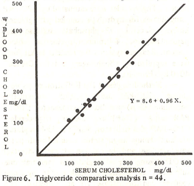 Figure 6 shows comparison of Reflotron cholesterol estimation c whole blood vs that on serum of the same samp1. Correlation coefficient of r = 0.98 with regression of y8 .6 + 0.96 x. Both estimations show good comn