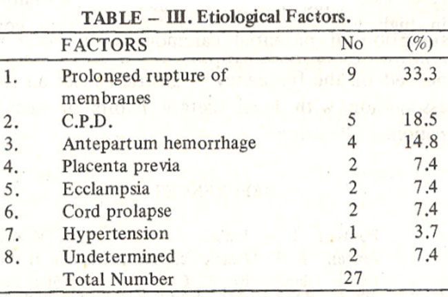 Prolonged rupture of membranes (more than 24 hours) was the cause in 33% cases followed by cephalopelvic disproportion and antepartum hemorrhage.