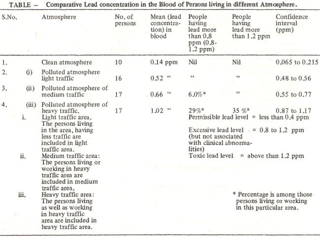 The table shows the plasma lead levels in people living in clean and polluted areas. Plasma lead levels varied from 0.14 - 0.4 ppm in persons living in clean areas. All individuals living in light traffic areas had lead levels below and only 6% from medium traffic area above 0.8 ppm. None of the latter group had levels more than 1.2 ppm. Lead levels of those living in heavily polluted areas varied from 0.64 - 1.6 ppm and only 35% had levels above 1.2 ppm.