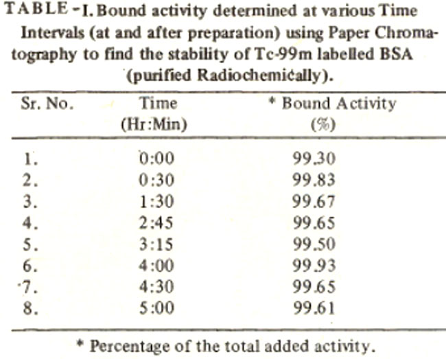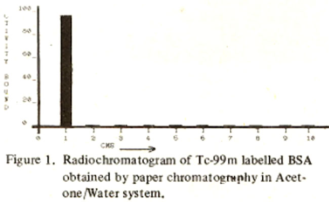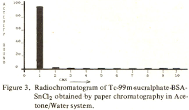 Stability and Radiochemical purity of Tc99m-BSA was checked by paper chromatography (Whatman No. 1 ,Acetone 90%: Water 10%). For checking stability, radiochromatograms of final yield of Tc99m-BSA were obtained at different hours after preparation. Radiochemical purity of final yield of labelled sucraiphate was also checked by paper chromatography. The stability of tagged drug was checked by suspending the drug in HC1 solution at low pH (approximately 1) and incubating the mixture in different tubes at 37°C for different time intervals. After each incubation the mixture was centrifuged and washed. Activity in the residue and supernatant was measured to assess bound and floating fractions.