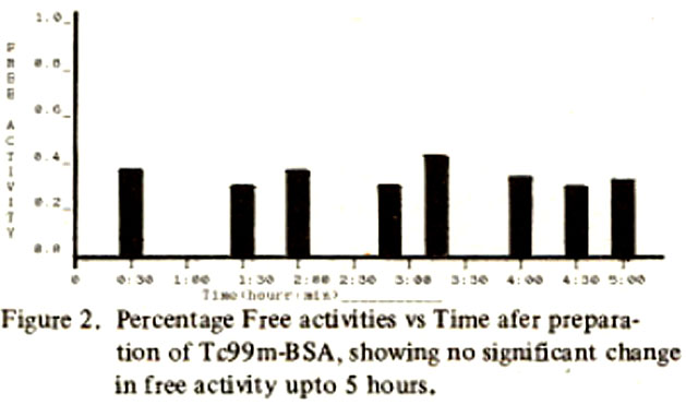 Tc99m—HSA was prepared by first reducing 5—lOmCi (200—400 MBq) pertechnetate (Tc04) with stannous chloride in acidic medium and then adding this mixture to 0.1% solution of BSA. The pH was then adjusted to 6 with dilute NaOH. The unreacted radioactivity was removed by passing the mixture through Dowax-l anion exchange resin (Tc99m-BSA appears in eluate and free 99m leO4 is retained by the resin)8.