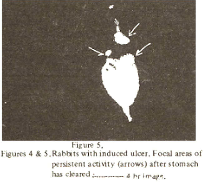 No area of focally increased activity in any of the rabbits was seen during the entire study. Clearance of radioactivity was however slow and diffuse images of stomach were obtained even after 3 hours of administration of labelled agent. No activity was detected outside GIT untill 4 hours of study. Slight radioactivity in the thyroid was seen after 4 hours. Activity was almost completely moved from stomach at 24 hours into the lower gut which was visualized.