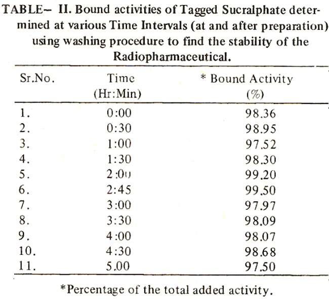 Bound activities of Tagged Sucraiphate determined at various Time Intervals (at and after preparation) using washing procedure to fmd the stability of the Radiopharmaceutical.