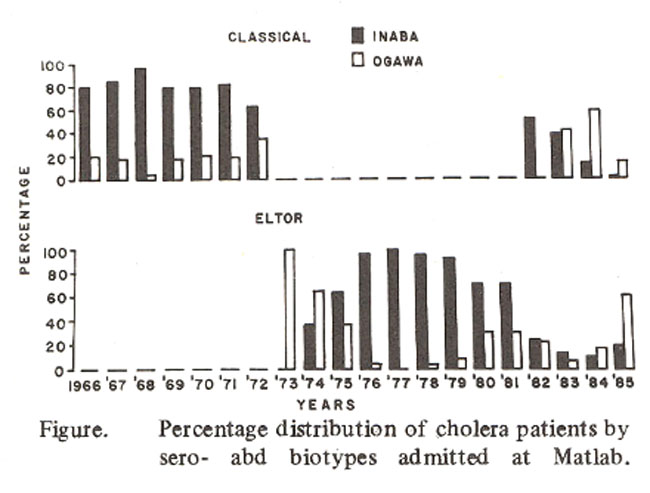 The figure which displays the percentage of each bio-serotype isolated among all V. cholerae 01 isolated that year shows that the classical biotype, predominantly Inaba serotype caused all cholera until,1972. In 1973 El Tor replaced the classical biotype. Again in 1982 the classical biotype displaced the El Tor as the main epidemic strain in Bangladesh7. The shift from classical to El Tor and again return of classical still remain a mystery. Presently a majority of our cholera patients are infected with El Tor Ogawa. In the same villages within our surveillance area, one or both of the bio and serotypes of v. cholerae 01 may be present at different times. Why and how these changes occur require further research, particularly on body immunity, environmental and ecological factors which might influence these changes.
