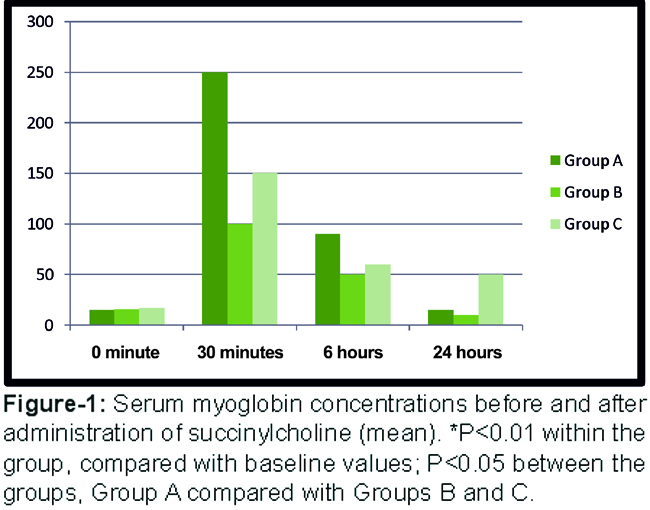 The highest levels of myoglobin venous blood concentration were observed at 30 min after succinylcholine administration (p<0.01) (Figure-1).