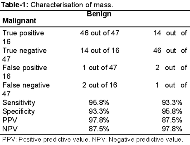 Results: The age of the 63 patients in the study ranged between 14 and 84 years. The sensitivity and specificity of the imaging procedure for the assessment of benign lesion was 95.8% and 93.3% respectively, and for malignant lesion, 93.3% and 95.8% respectively. In diagnosing uterine mass, the values were 100% and 97.5% respectively, for ovarian mass, 97.3% and 96% respectively, and extra uterine/extra ovarian mass, 66.6% and 100% respectively.