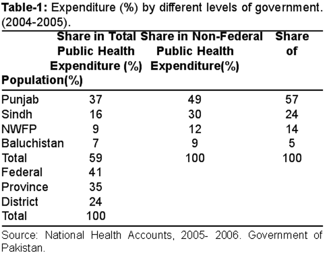 The federal government manages 41 per cent of total public expenditure in health. A summary of public health expenditure by the federal government and four provinces for 2004/05 is a relevant document (Table).