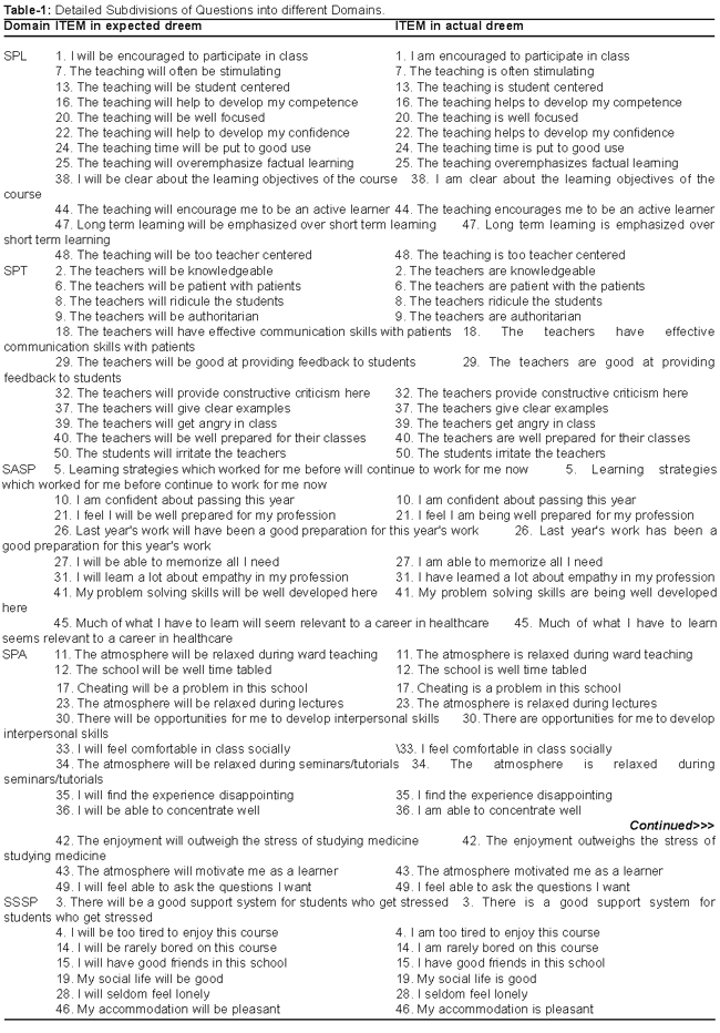 The DREEM questionnaire was administered to 450 first year students of DUHS in their first week of university before a lecture. This provided us with the set of expected perceptions of the students. In advance to administration of the questionnaire, the class was informed about the purpose and process of data collection, the anonymity of the participants was stressed upon and they were requested for their co-operation. The questions for actual and expected DREEM proformas were changed according to the students\' understanding and are shown in detail in Table-1. The changes were reviewed and approved by an international medical education consultant as well as the ERB. This version has also been used in a previous study.12 Consent was received before participation and 411 students submitted a complete proforma. The rest were either submitted incomplete or were not submitted altogether.