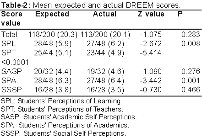 Table-2 shows the mean (SD) expected and actual DREEM total and domain scores. The mean total expected dreem score was 118/200 and the mean total actual dreem score was found to be 113/200. For Students\' Perceptions of Learning (SPL), Students\' Perceptions of Teachers (SPT), Students\' Academic Self-Perception (SASP), Students\' Perceptions of Atmosphere (SPA) and Students\' Social Self Perceptions (SSSP), the mean expected domain scores are 28/48, 25/44, 20/32, 28/48, 16/28 and the mean actual domain scores are 27/48, 23/44, 19/32, 27/48, 16/28. No significant differences were found in the expected and actual perceptions overall (z=-1.075; p=0.283). Significant differences were observed in SPL (z=-2.672; p=0.008), SPT (z=-5.414; p<.0001) and SPA (z=-3.442; p=0.001).