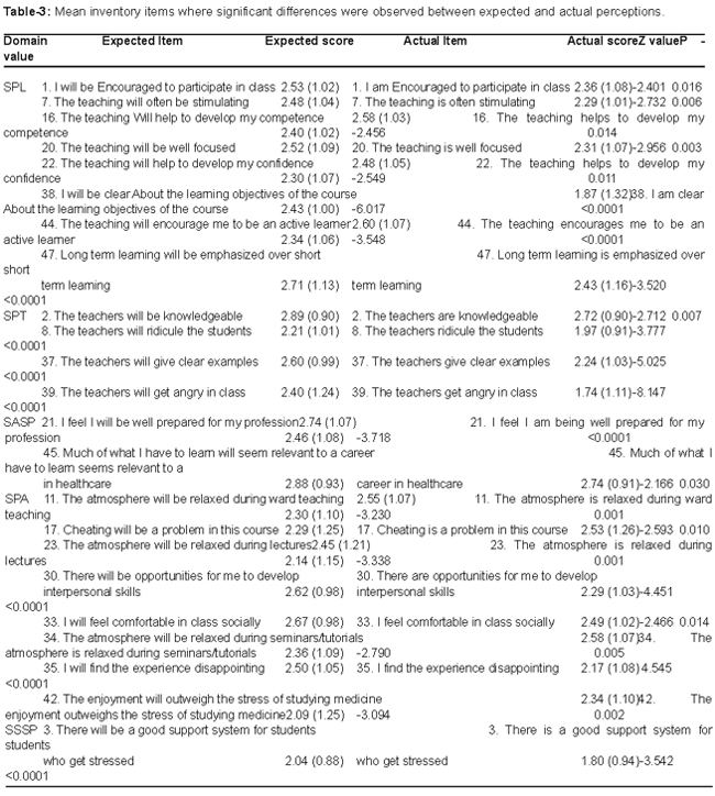 Areas showing significant differences in the expected and actual perceptions are shown in Table-3. Most of these showed a lower actual score than expected score. They felt that they were not encouraged much to participate in learning and be an active learner, the teaching was less stimulating and less focused than expected, it did not help them greatly in developing their competence and confidence. The students also felt that long term learning was not instilled as much as they had expected. The teachers were less knowledgeable than expected, they felt irrelevance to the subject was more and they weren\'t as well prepared as they had expected. A number of reasons could have caused these problems but the major issue was that the class presentations provided by the teachers were lengthy and often irrelevant to the topic being taught. Also, most teaching was done through lectures rather than PBL (problem based learning) sessions where students can participate during classes and learn together in groups. In all kinds of interactions during sessions, lectures and ward teachings, the atmosphere was less relaxed and there were fewer opportunities for them to develop interpersonal skills. This was of concern and when investigated it was revealed that students preferred small group sessions over big lectures and this was lacking at our university. There is an international move from traditional curriculum towards the learner — centered, and patient-oriented curriculum; in this study the modified PBL method was the preferred one for 39% of the students, followed by the PBL (36%) and lastly the lectures (25%).17 But some of these problematic points that improved over the year were that students were clearer about their learning objectives and they found cheating to be more difficult than they had expected.