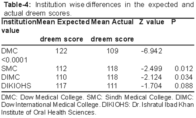 The two sets of data were compared for the total DREEM score as well as each of the subtotal scores of the subscales using spss version 16.0. The individual scores of each question were also compared. Since the data was not normally distributed; p<0.0001 for expected perceptions and p=0.009 for actual perceptions using the Shapiro-Wilk test for normality), Wicoxon Signed Rank test was used to compare actual versus expected perceptions. The institution wise differences were also analyzed using Wicoxon Signed Rank test.