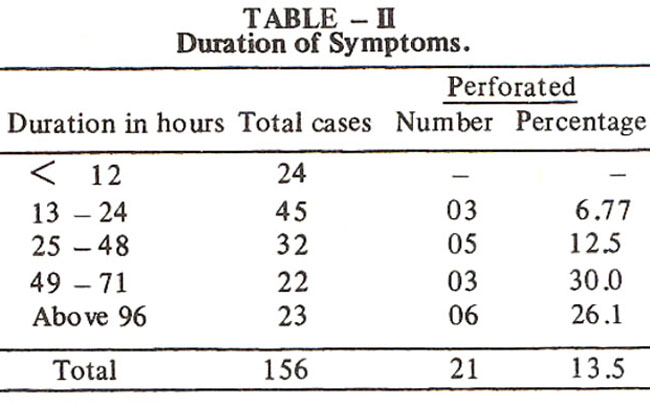 In the present series, perforation was observed in 13.5% patients with acute appendicitis. A perforation rate of 189% has been reported by Silberman1