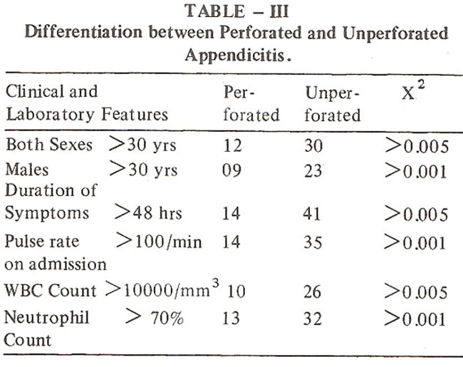 To determine the differentiating features of perforated appendicitis, age, sex, duration of symptoms before admission to hospital, physical signs, total and differential white cell count, the. incidence of post operative complications as well as duration of hospitalization were analyzed.