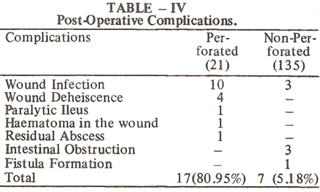 The incidence of complications in the perforated was 81%, and in iIon-perforated 4.3%. The commonest complication, wound infection, occurred in 14 of 31 patients with perforation and 3 of 135 patients in the unperforated group (Table IV).