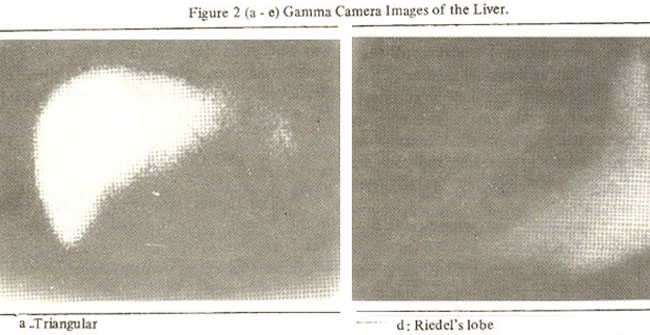 The liver is the largest solid organ in the human body1 .it is a pliable organ and is moulded by adjacent structures such as the right lung and right kidney. Supradiaphragmatic abscesses can flatten the top of the right lobe, or the dome the liver may move upwards as a result of splinting of the diaphragm or phrenic nerve paralysis. The liver exhibits many variations in shape on radionuclide scanning. The left lobe of the liver may be prominent, yielding a quadrilateral configuration or it may be so small that it cannot be seen. The porta hepatis may be prominent. The gallbladder may indent the inferior margin of the right lobe. The rib cage may indent the liver producing a linear defect2-4 Riedel’s lobe, a tojigue like downward projection of the right lobe may be felt as a mobile tumour in the right side of the abdomen and may be confused with other tumours in this area5. The objective of the present study was to find out the normal shapes of the liver in our area and compare our findings with those reported in the literature.