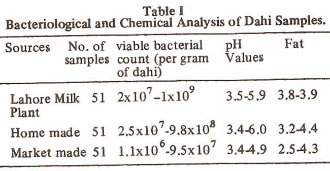 Most of the samples of Lahore Milk Plant dahi were of good physical appearance, sweet in taste and 58% of them gave typical aroma. The pH ranged from 3.5 to 5.9 and butter fat was 3.8%; whereas total bacterial count ranged from 2x107 to 1x109 organisms per ml.
