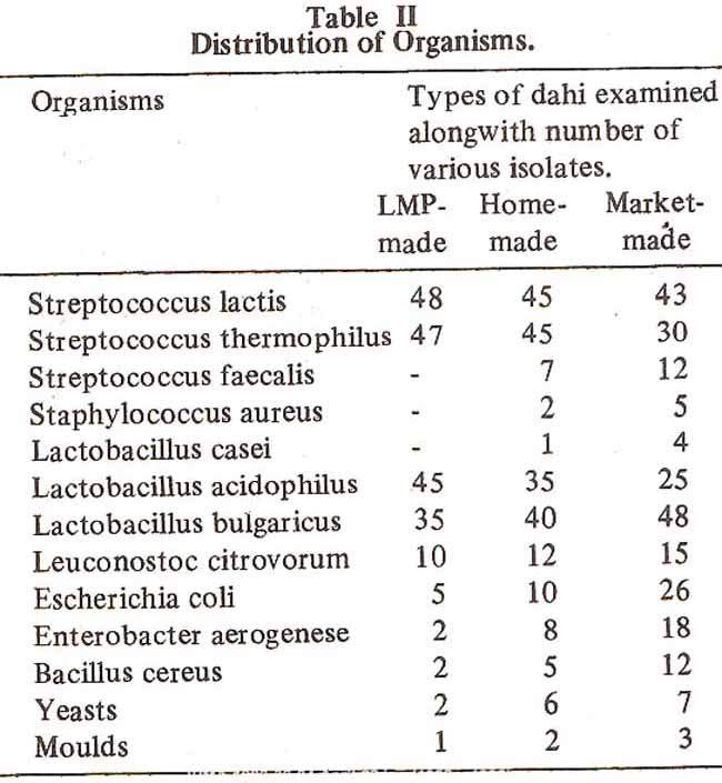 The common organisms isolated from all the three sources were Streptococcus lactis, Streptococcus thermophilus, Lacto bacillus acidophillus, Lactobacillus bulgaricus, Leuconostoc citrovorurn, Escherichia colt, Bacillus cereus, Enterobacter aerogenese, yeasts and moulds. However, Streptococcus faecalis, Lactobdcillus casei and Staphylococcus aureus were found only in a few samples among home made and market-made dahi (Table II).