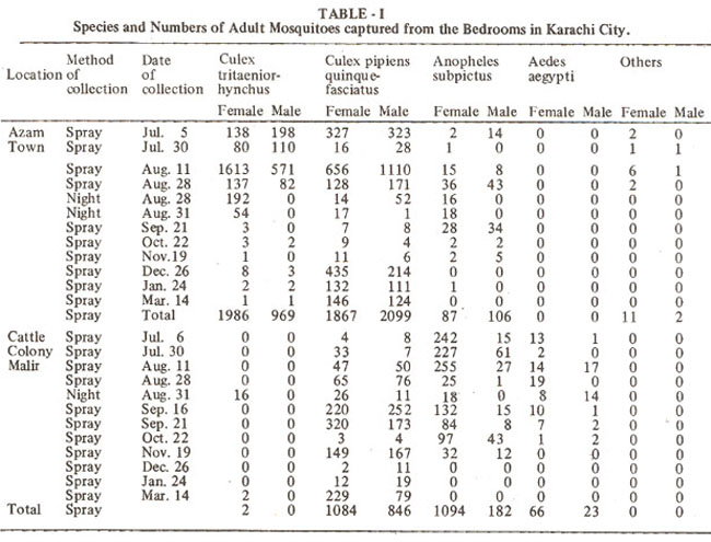 Adult mosquitoes were collected mostly by spray sheet collections and sometimes hand collections from the resting sites of mosquitoes. In addition to these, mosquitoes were also collected from cattle sheds at night. For the spray sheet collection, white sheets were laid over the entire floor and beds in the room, all doors and windows were closed and pyrethrum in Kerosene was sprayed. After about 10 minutes killed adult mosquitoes were collected from the sheets. To detect larvae, dips of water were examined at each breeding place in the same localities which are mostly adjacent to tributaries of Lyari river into which sewerage is discharged.