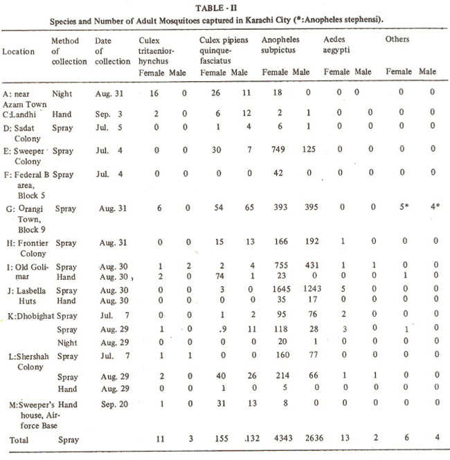 Table 1 underside and Figure 3 indicate the number of adult mosquitoes captured at Cattle colony Malir, Karachi. Cx. pipiens quinquaefasciatus, the principal vector of filariasis appeared in all seasons, and their common breeding places were cesspools and ditches in human habitation. An. stephensi, the principal vector of malaria, were rare. An. subpictus were abundant from July to October, and their common breeding places were ground pools, cesspools and ditches in the human habitation and along riversides.