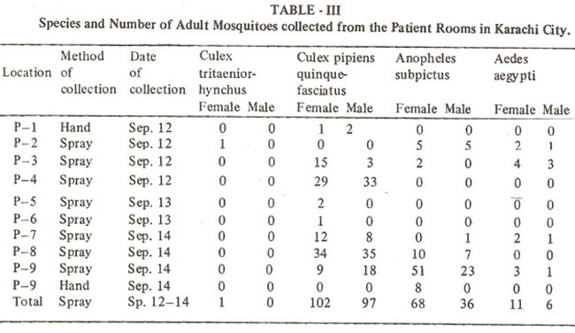 Table III indicates the number of adult mosquitoes captured in the bedrooms of nine encephalitis patients. Number of resting mosquitoes were fewer than those on the riverside. Cx. tritaeniorhynchus (abundant in the outskirts and the riverside of Karachi area) were fewer in the houses of encephalitis patients.