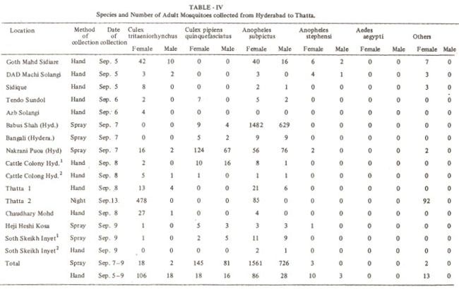 Table IV shows the number of adult mosquitoes captured at the outskirts from Thatta to Hyderabad. Cx. tritaeniorhynchus were breeding abundantly in the rice fields, swamps and ground pools.