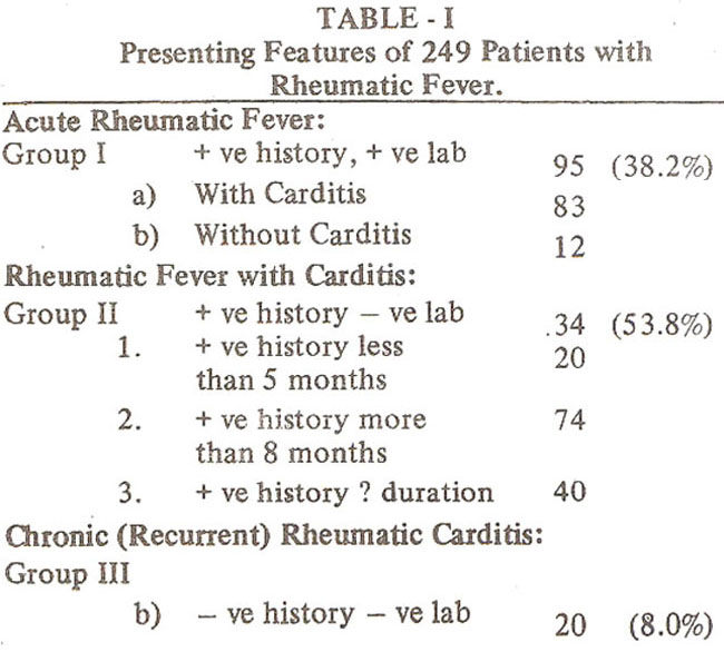 A large number of patients in group II had acute rheumatic fever for more than eight months and some presented after few years of the event of acute Rheumatic fever. In this group the presentation is not of ARF but its sequelae namely carditis. In approximately a third of these no definite date of an event such as fever or joint pain or Tonsillitis could be elicited. All patients with carditis should have, throat culture, ESR & ASOT estimation so that activity can be detected, since in significant number of patients the dating of onset can-not be determined.