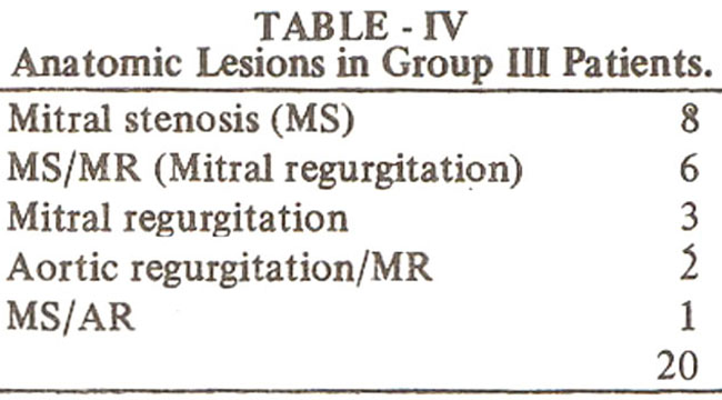 The third group of patients with Rheumatic carditis presented with evidence of valvulitis 12but no preceding history of joint pain or fever could be elicited and ESR & ASOT titre were within normal limits at the time of presentation. There were 20 patients in this group (Table IV).
