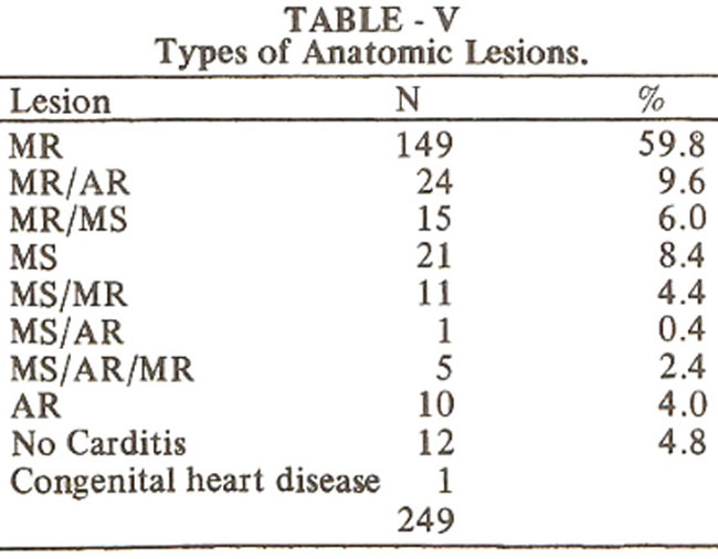 The most frequent lesion among the groups was mitral Insufficiency which occurred in 59.8% of cases. Isolated mitral steñosis was noted in 8.4% and Isolated Aortic regurgitation was present in 4% (Table V).