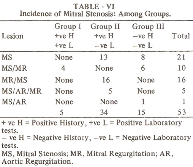 Patients with mitral stenosis, recurrent acute Rheumatic fever has been diagnosed by positive history and positive lab tests. rhis may not be a direct evidence but coupled with unusually high incidence of mitral stenosis in younger age provides a strong evidence for Rheumatic etiology. Only one patient with congenital cardiac malformation (LTGH & VSD) was seen who developed ARF diagnosed by a positive history and positive laboratory tests. Furthermore majority of patients (38/53) with mitral stenosis had a positive history and positive laboratory tests.