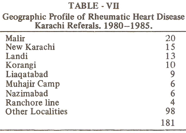 Majority of patients (77%) came from Karachi (Sind) and only 15 patients (6%) were referred from Sind interior. Others iiicluded 3% from Sarhad, and 5% each from Punjab and Baluchistan. In 20 patients (8%) the address was not recorded. Analysis of data from Karachi referals showed that overwhelming majority of patients belonged to kachi Abadis. New Karachi, Malir, Landi and Korangi had the heaviest concentration of Rheumatic patients. The patients were however scattered through out the poor communities in the city (Table VII).