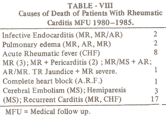 Subacute bacterial endocarditis was noted in 8 of 249 patients during the follow up period, six of whom had mitral regurgitation. Two patients with bacterial endocarditis died. Causes of death on medical follow up were analysed and showed that majority (8 of 17) died due to cardiac failure consequent to Acute Rheumatic fever and majority of these had two or more valve lesions. Bacterial endocarditis (2 patients), pulmonary edema (2 patients), severe CHF (1 patient), cerebral embolism (1 patient) and Digoxin over dose (1 patient) accounted for the remaining deaths (Table VIII).