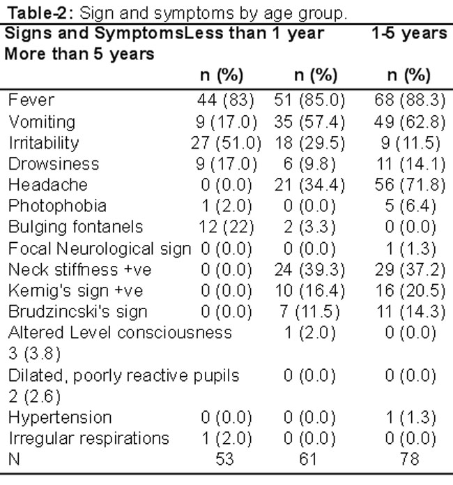 Results: A total of 192 patietns were enrolled. The presenting complaint in 165 (86%) patients was fever; vomiting in 93 (48.43%); and 49 (52.68%) of them were more than 5 years old. Irritability was present in 54 (28.12%) children, of whom 27 (50%) were less than one year. Fits were present in 47 (24.47%) cases out of which 21 (44.68%) were less than one year. Neck stiffness and signs of meningeal irritation, Kerning\'s sign and Brudzincski\'s sign, were present in 53 (27.60%) patients; 26 (13.54%); and 18 (9.3%) respectively. These signs were more common in children over 5 years of age, reflected by 29 (54.7%), 16 (61.5%) and 11 (61.11%) patients respectively. On presentation, headache was found in 77 (40.10%) children among whom 56 (72.72%) were over 5 years. Besides, 151 (78.6%) patients required admission to the ward, while 40 (20.8%) were admitted in High Dependancy Unit/critical care units. Adverse outcome was observed in 6 (3.12%) patients.