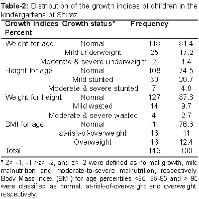 In this study, the prevalence of underweight, stunted, wasted and overweight or at-risk-of-overweight children were measured. In two other studies, one conducted on the children of South Khorasan, a province in Iran, and another on the children of western Kenya, indicated that the prevalence of moderate and severe underweight, stunting and wasting were higher than those found in this study. This difference can be explained in terms of the prevalence of poverty and inappropriate dietary intake in these two settings.21,22
