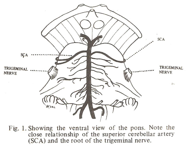 The mechanism producing trigeminal neuralgia lacks a satisfactory explanation. Dandy1 in 1934 first suggested that arterial compression and distortion of the trigeminal nerve at its point of entry into the pons couId be a possible etiological factor in this condition. Sunderland2 reported that superior cerebellar artery (SCA) or one of its branches frequently looped around and made contact with the root of the trigeminal nerve. Hardy and Rhotson3 have also studied this microsurgical relationship and have discussed the role of neurovascular contact. Jannetta4 has studied the problem in living subjects undergoing posterior fossa operations. Mehta et al.5 concluded their study by saying, “While the possible role of such neurovascular contact in the genesis of neuralgia is of interest, a causal relation cannot be established”.
