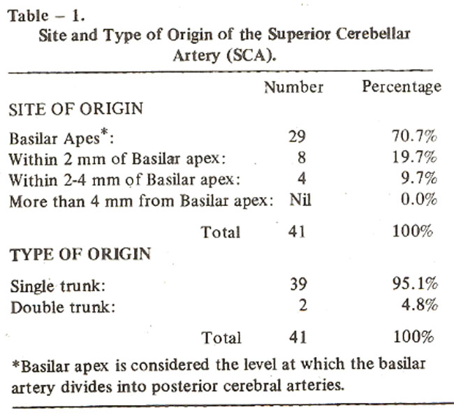 Our observations support the previously held view that SCA is the most consistent in its origin and location of all the posterior cranial fossa arteris6,7. Thirty-nine (95.1%) SCA’s arose as single trunks and only two (4.8%) were found as duplicate vessels of the 41 SCA’s studied (Table 1). This duplication of vessels was only unilateral. Bilateral duplication was not seen. Most (70.7%) of the SCA’s arose from the basilar apex (Table 1).